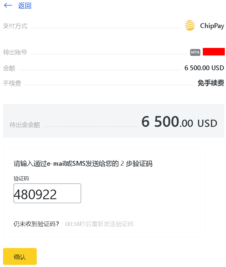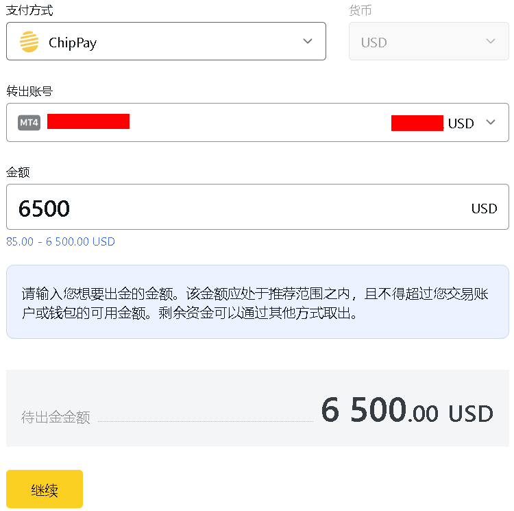 2、输入支持的出金额,每种方式最小和最大区间额度不一样,点击继续。