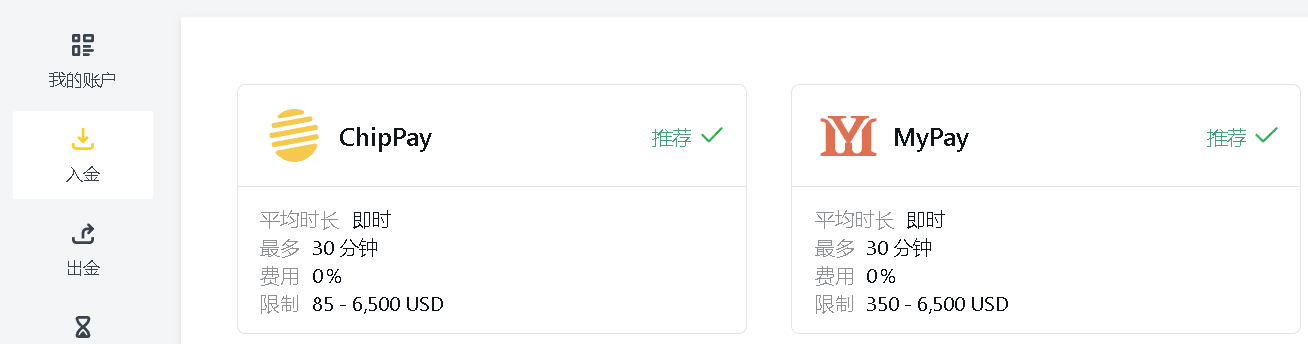 3、点击入金,有多种入金方式,目前最受欢迎的就是ChipPay和MyPay,这里以ChipPay为例。