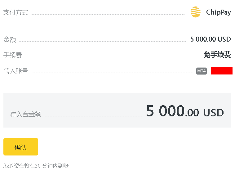 12、点击我已经完成汇款,等待处理,最快即时到账,最慢30分钟到账。登录账户,查看我的账户,交易账号可用保证金5000美元,入金成功,此时可以下载登录MT4/MT5软件,进行交易了。