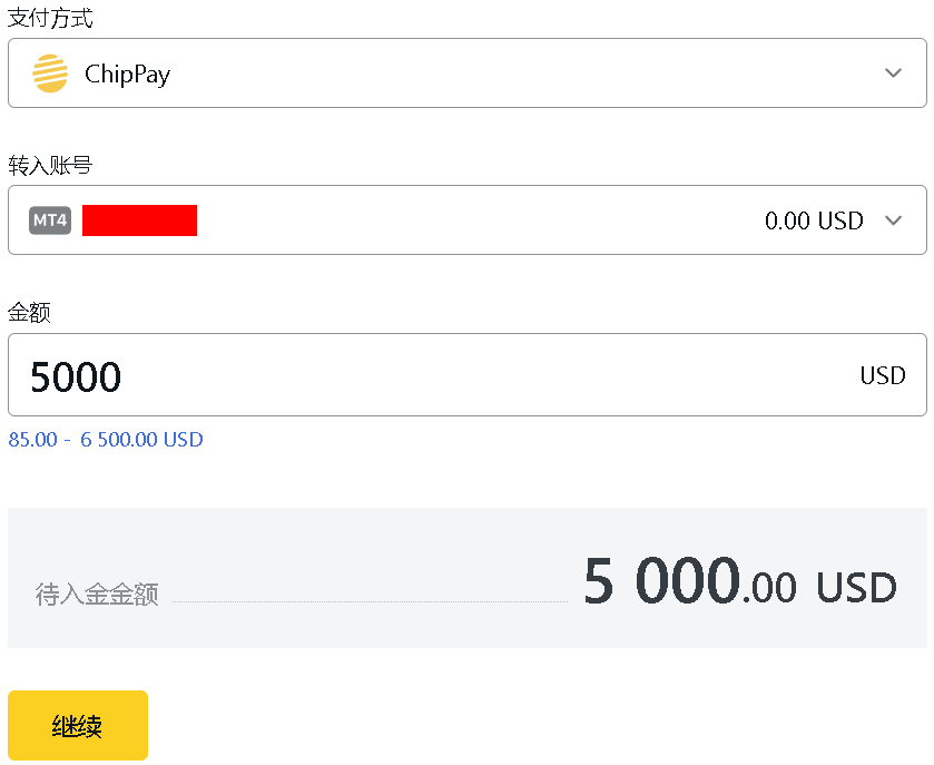 4、选择要入金的交易账号,输入入金金额,最大6500美元,点击继续。