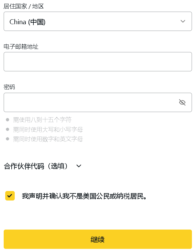 1、打开【Exness外汇注册地址】,右上角新账户选择国家地区China(中国),密码必须包含大写字母、小写字母、数字,密码设置8位到15位。