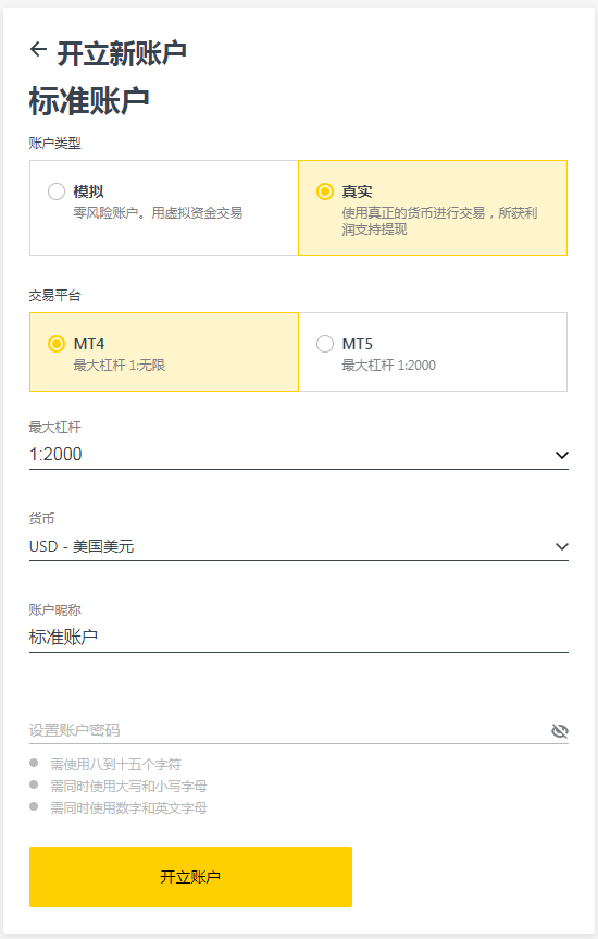 13、比如新建一个MT4标准账户,选择杠杆,设置一个昵称和交易密码,点击完成,一个新账户就添加完成了,并显示在账户列表中。