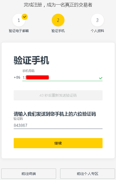 4、输入收到的短信验证码,点击继续。